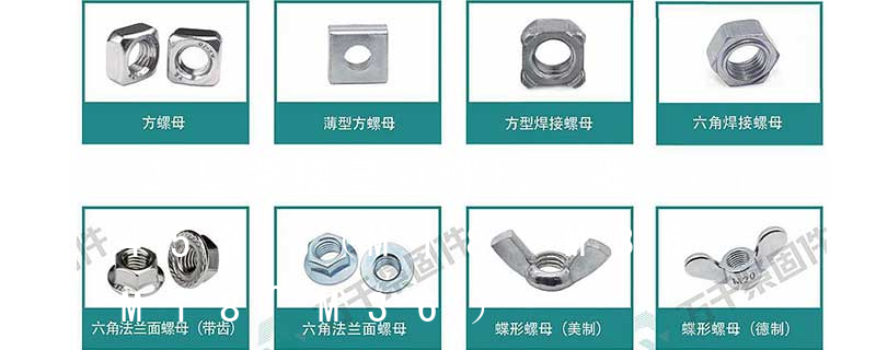六角法蘭面螺母細(xì)牙GB/T 6177.2—2000;1型六角開槽螺母—A和B級GB 6178—86;1型六角開槽螺母—C級GB 6179—86;2型六角開槽螺母—A和B級GB 6180—86;六角開槽薄螺母—A和B級GB 6181—86;2型非金屬嵌件六角鎖緊 大小不同,螺紋不等分為不同的規(guī)格.一般國標(biāo)、德標(biāo)用M表示(例如M8、M16),美制、英制則用分?jǐn)?shù)或#表示規(guī)格(如8#、10#、