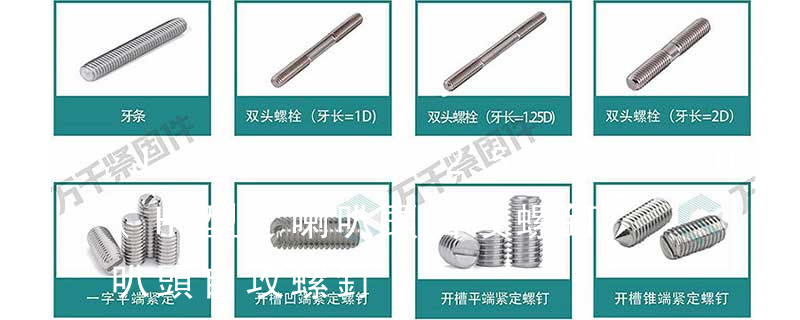 螺栓有:1、方頭螺栓,2、半圓頭方頸螺栓,3、十字槽盤頭螺釘,4、內六角沉頭螺釘,5、方螺母C級,6、蝶形螺母,7、六角頭螺栓,8、十字槽盤頭自攻螺釘。大小有M18、M6、M8、M16、M10、M12、M14、M20等型號。通常用