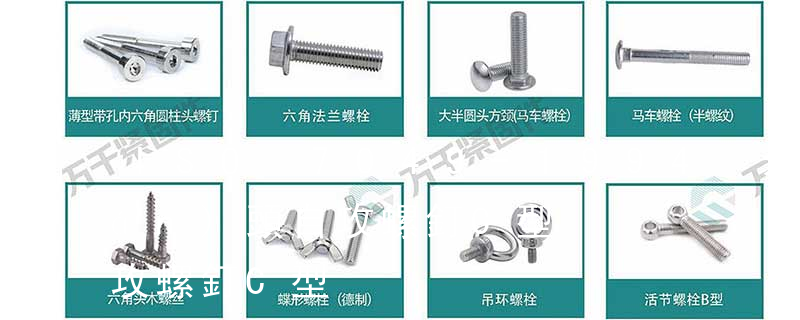 螺栓有:1、方頭螺栓,2、半圓頭方頸螺栓,3、十字槽盤(pán)頭螺釘,4、內(nèi)六角沉頭螺釘,5、方螺母C級(jí),6、蝶形螺母,7、六角頭螺栓,8、十字槽盤(pán)頭自攻螺釘。大小有M18、M6、M8、M16、M10、M12、M14、M20等型號(hào)。通常用 自切自攻螺釘有以下幾種型式:十字槽盤(pán)頭自切自攻螺釘,十字槽沉頭自切自攻螺釘。十字槽半沉頭自切自攻螺釘,六角頭自切自攻螺釘。3、自擠自攻螺釘(自攻鎖緊螺釘)自擠自攻螺釘?shù)穆菁y一般為機(jī)螺紋,很少采用自攻螺紋。在扳擰